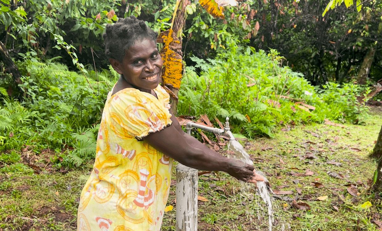 “Sebelum krisis Bougainville, komunitas Takee memiliki air yang layak karena tidak ada permukiman di pegunungan dan air bersih mengalir dengan baik. Saat krisis, kami naik ke gunung dan tidak memiliki toilet yang layak, sehingga kami menggunakan sungai yang mengalir dan akhirnya tercemar. Setelah krisis, kami turun kembali dan sulit meninggalkan tempat itu karena air sudah terkontaminasi. Bagi perempuan, sangat sulit memasak dengan air bersih, dan para pelajar tidak bisa datang ke sekolah tepat waktu karena harus mencari air bersih. Kami harus berjalan jauh untuk mengambil air dan mencuci pakaian,” ujar Doris Pangara, anggota komunitas Takee, Bougainville.